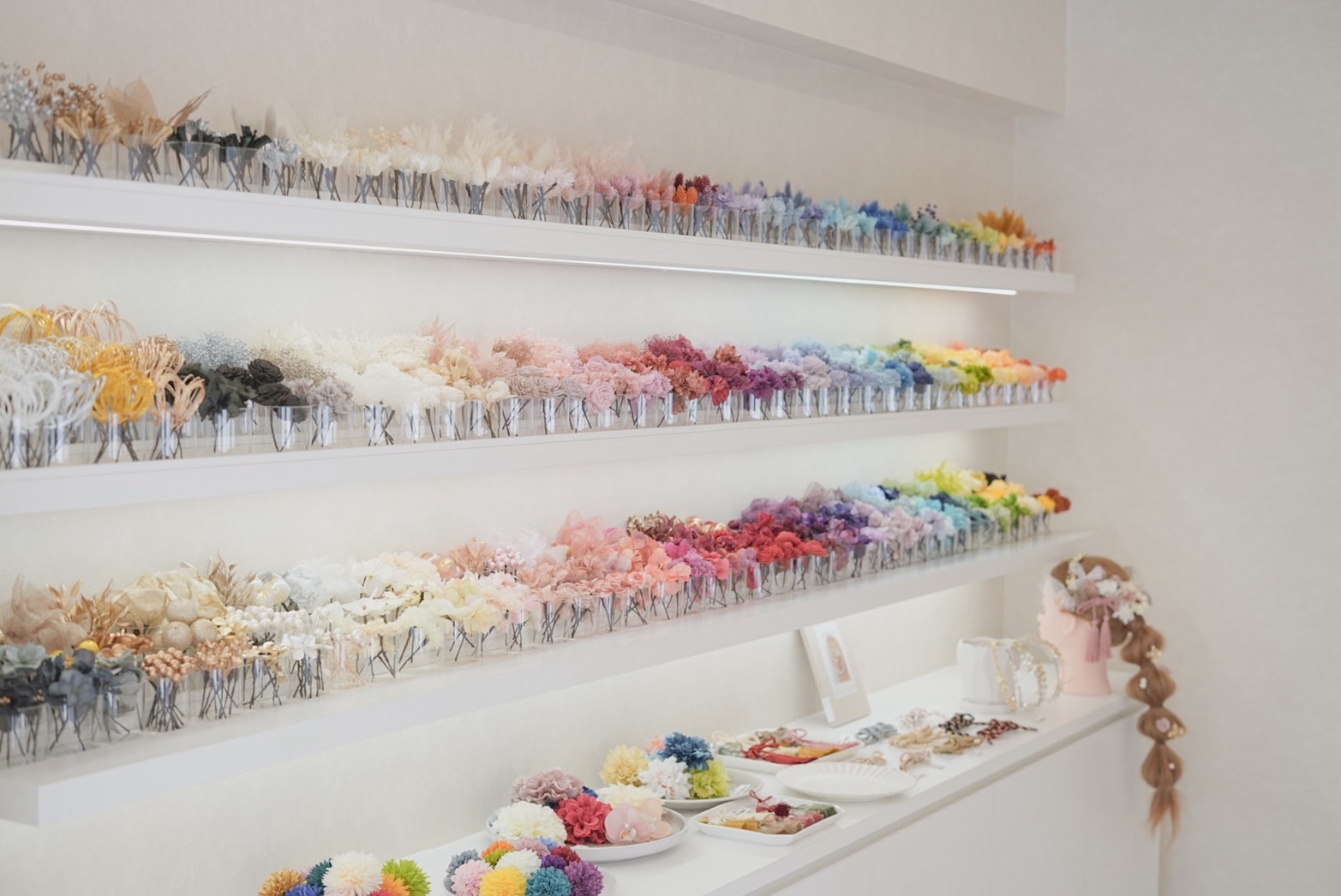 500種類以上の花材・リボン・パーツの中から、お好きなアイテムを自由に選び、自分だけのオリジナル髪飾りが作れる体験型サービス。 成人式、卒業式、七五三、結婚式など、特別な日をもっと華やかに彩る、あなただけの髪飾りをデザインします。