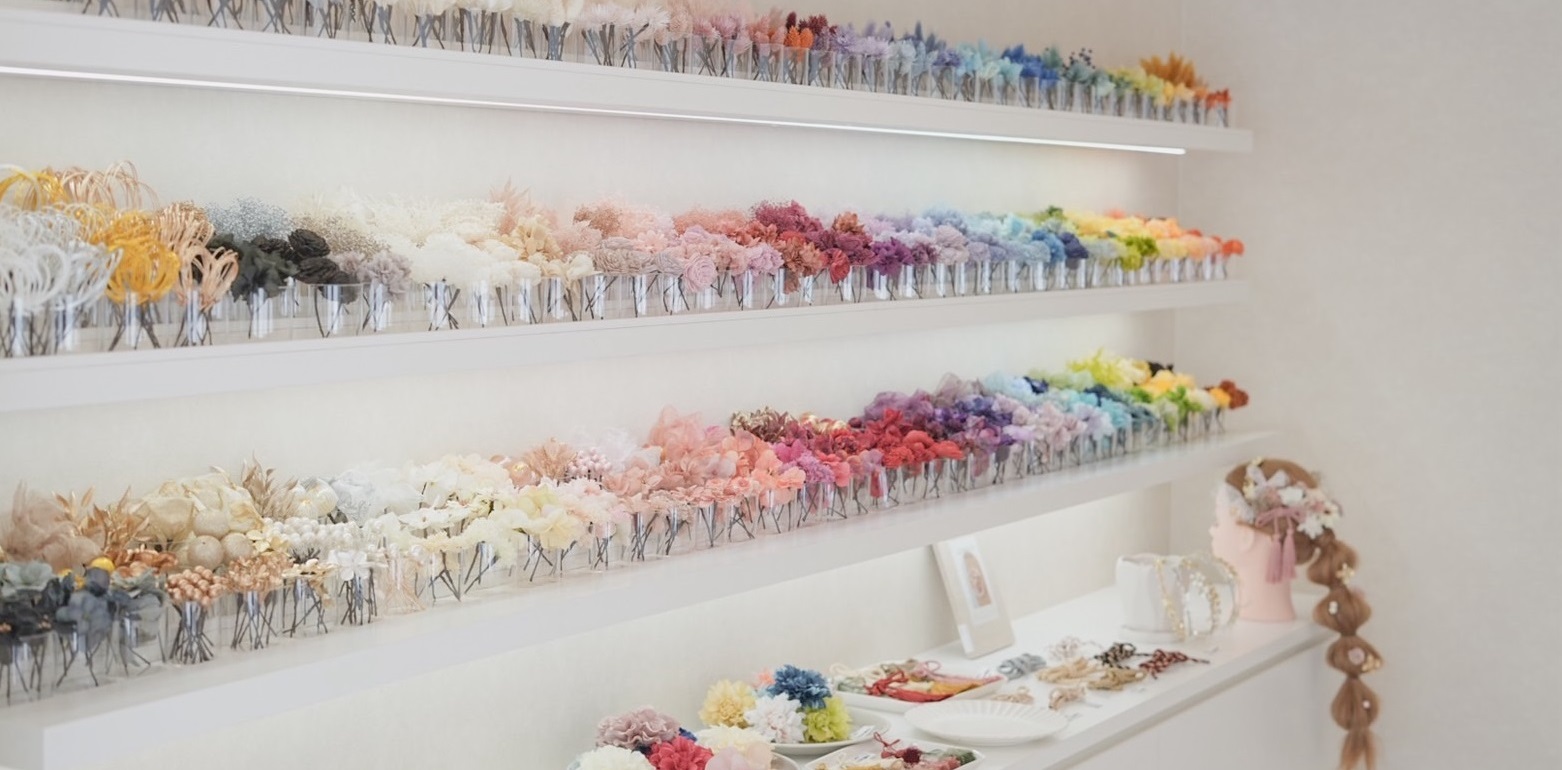 500種類以上の花材・リボン・パーツの中から、お好きなアイテムを自由に選び、自分だけのオリジナル髪飾りが作れる体験型サービス。 成人式、卒業式、七五三、結婚式など、特別な日をもっと華やかに彩る、あなただけの髪飾りをデザインします。